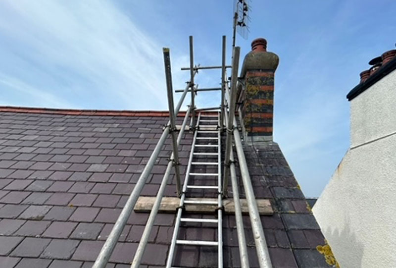 Scaffold erected on pavement in Llanberis for roof repairs and clearing away greenery on stacks including protection over next doors doorway.