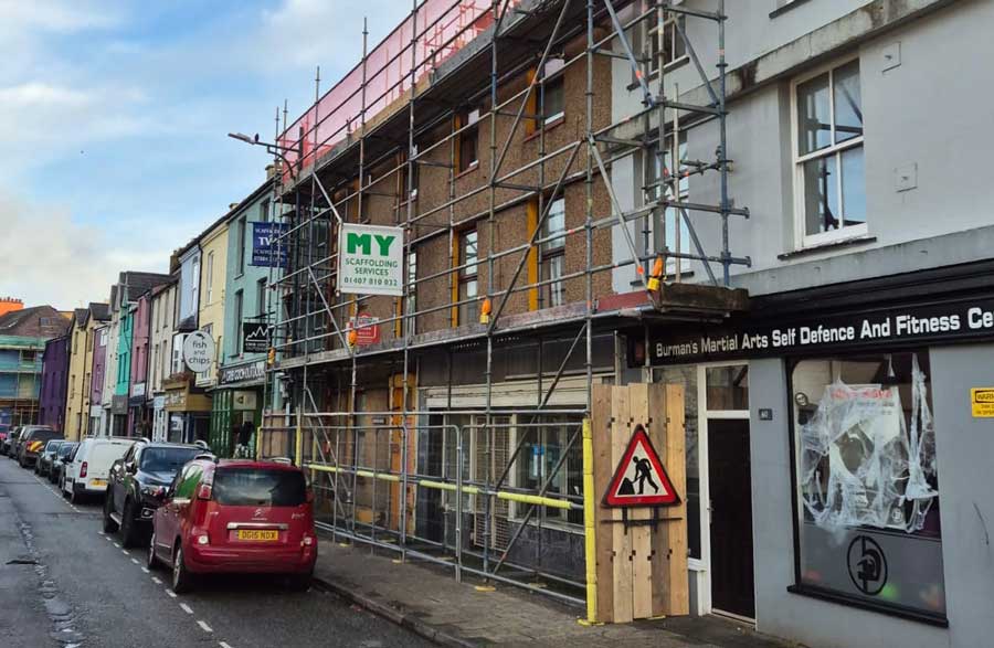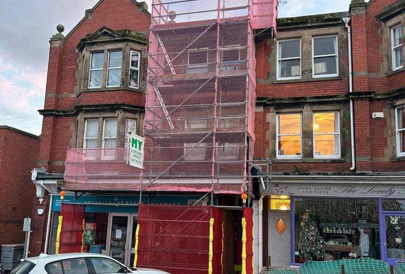 Pavement Scaffold erected in Rhos on Sea to investigate water ingress.